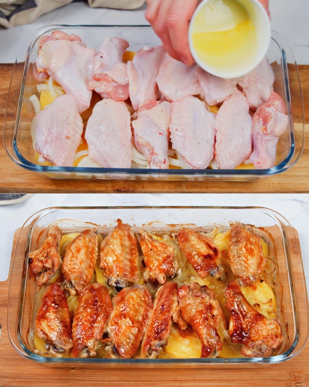 Skrzydełka kurczaka są często spożywane w weekendy, smażone i polane dużą ilością sosu. Ale czy wiesz, że skrzydełka z kurczaka możesz jeść również na danie w środku tygodnia? Nie ma powodu, dla którego skrzydełka z kurczaka musiałyby czekać do weekendu. W tym daniu ze skrzydełkami kurczaka i ziemniakami wszystkie składniki układa się warstwami w naczyniu do pieczenia, a następnie piecze, aż skrzydełka kurczaka nabiorą złotego koloru, a ziemniaki będą ugotowane. Białe wino i kurczak nie tylko dodają smaku, ale też sprawiają, że kurczak pozostaje soczysty i nie wysycha. Ponieważ wszystko jest przygotowywane w jednej patelni, a następnie gotowane, danie to doskonale nadaje się na zabiegane wieczory w tygodniu, gdy chcesz zjeść coś treściwego, bez wysiłku. Jest to również zdrowsze danie, ponieważ do jego przygotowania potrzeba mniej oleju niż w przypadku smażenia skrzydełek!